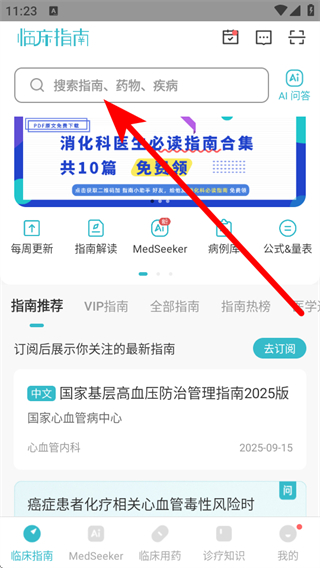 1、在臨床指南首頁,需要點擊頂部搜索欄,進入搜索輸入頁面。