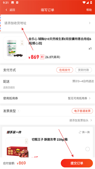 4、進(jìn)入填寫(xiě)訂單頁(yè)面,點(diǎn)擊請(qǐng)?zhí)砑邮肇浀刂?,填?xiě)信息,點(diǎn)擊提交訂單,完成支付。