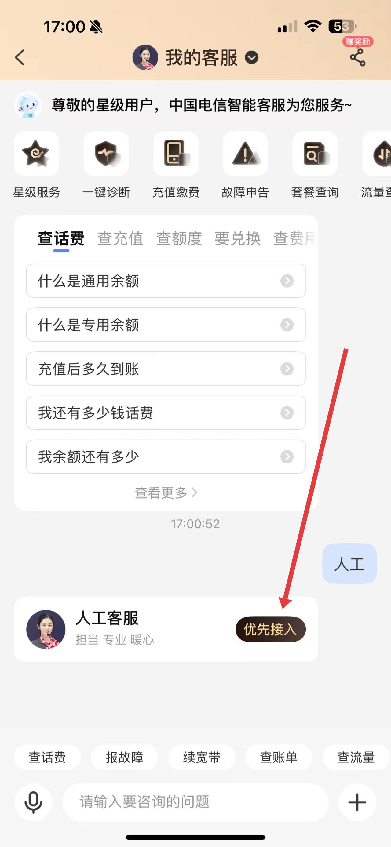 3、輸入完成后,點(diǎn)擊發(fā)送,界面會(huì)彈出人工客服選項(xiàng),點(diǎn)擊優(yōu)先接入按鈕,即可等待接通人工客服。