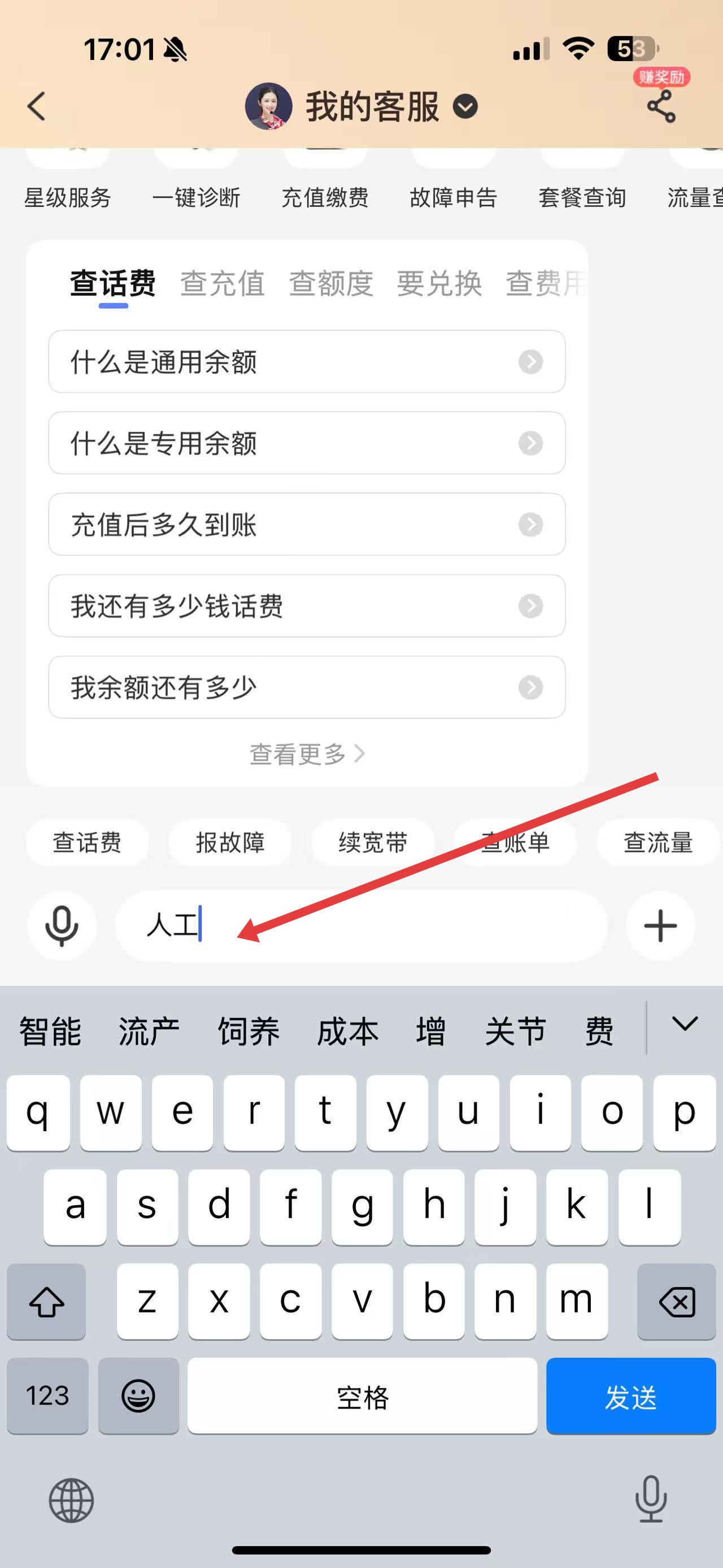 2、在我的客服界面下方的輸入框中,輸入關(guān)鍵詞人工。