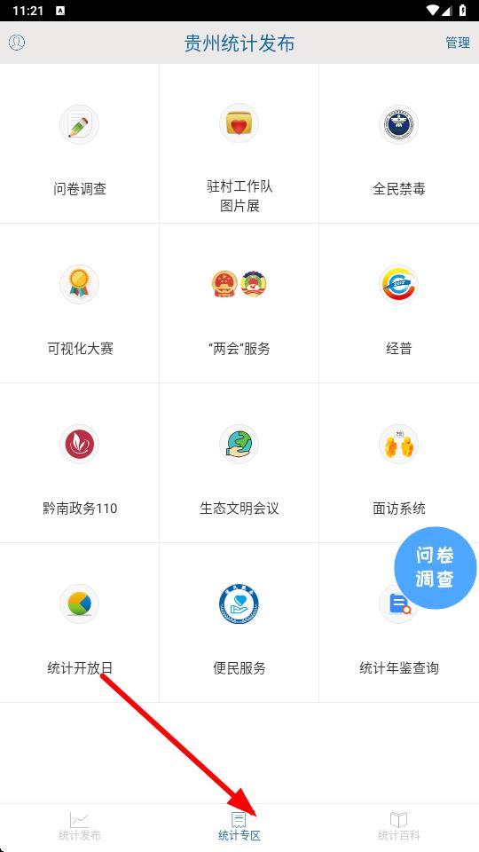1、開(kāi)啟貴州統(tǒng)計(jì)發(fā)布應(yīng)用程序,在底部導(dǎo)航區(qū)域,精準(zhǔn)定位并點(diǎn)擊統(tǒng)計(jì)專區(qū)選項(xiàng),進(jìn)入到功能聚合的專區(qū)頁(yè)面,這里匯聚各類統(tǒng)計(jì)相關(guān)服務(wù)入口。