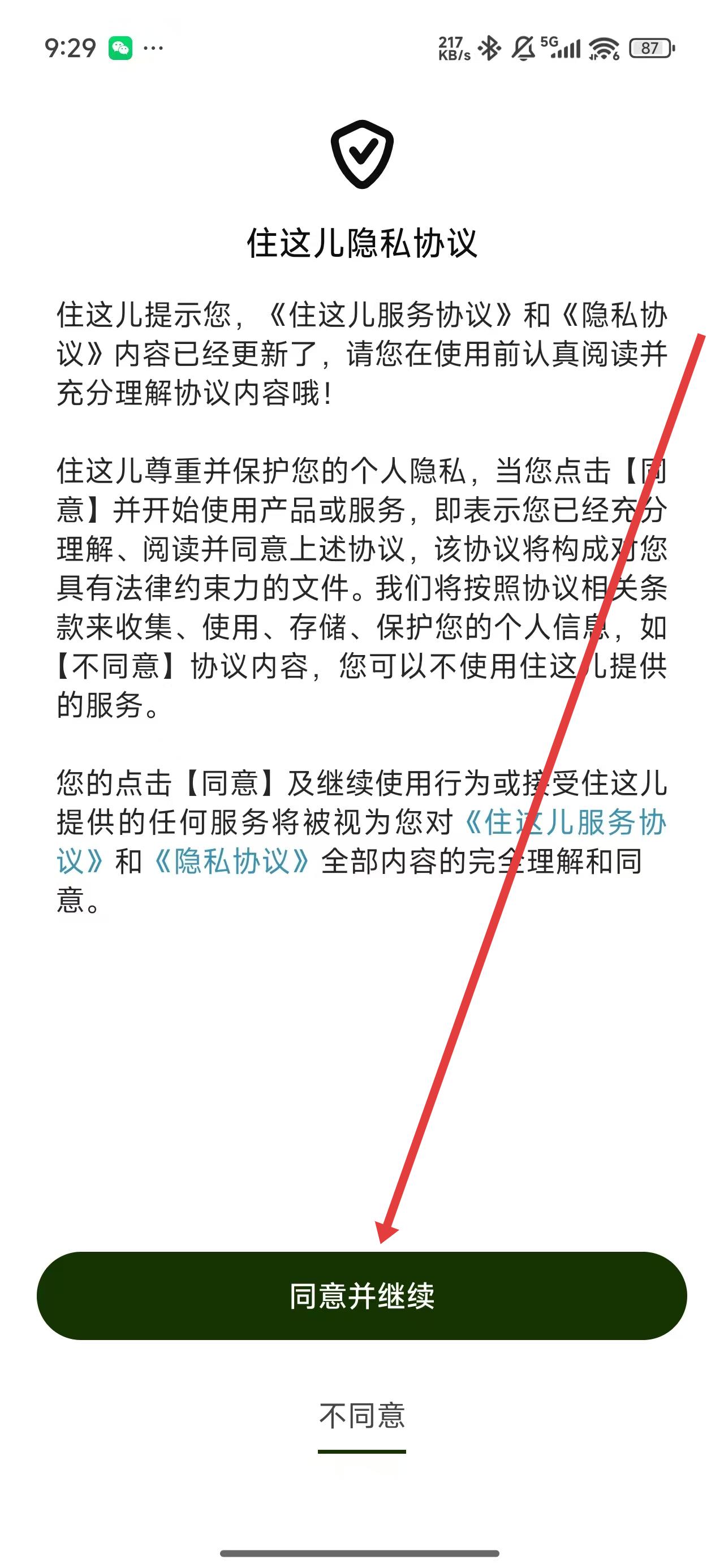 1、在進入到萬科業(yè)主app后,點擊同意并繼續(xù)按鈕開始進入使用。