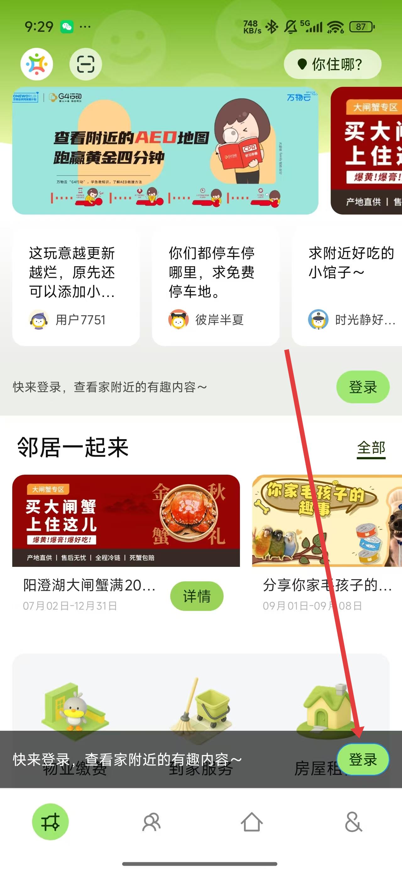 2、在萬科業(yè)主app首頁中,可以點擊下方的登錄按鈕開始登錄賬號。