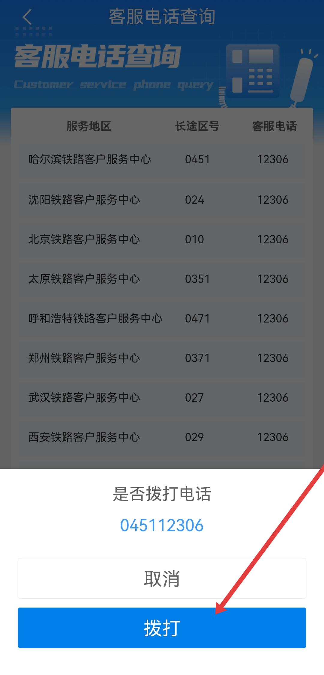 3、在客服電話查詢頁面,選擇對應服務地區(qū),點擊該地區(qū)的12306客服電話,在彈出的是否撥打電話提示框中點擊撥打,聯(lián)系鐵路客服。