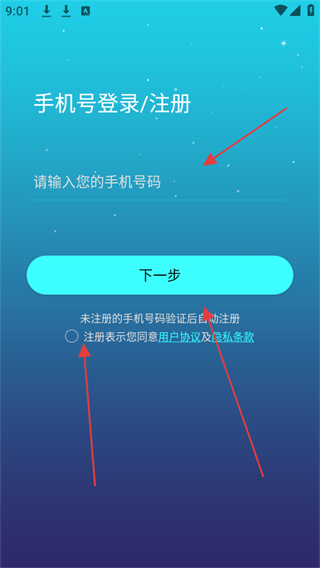 3、輸入手機(jī)號碼,勾選同意用戶協(xié)議及隱私條款,點擊下一步。