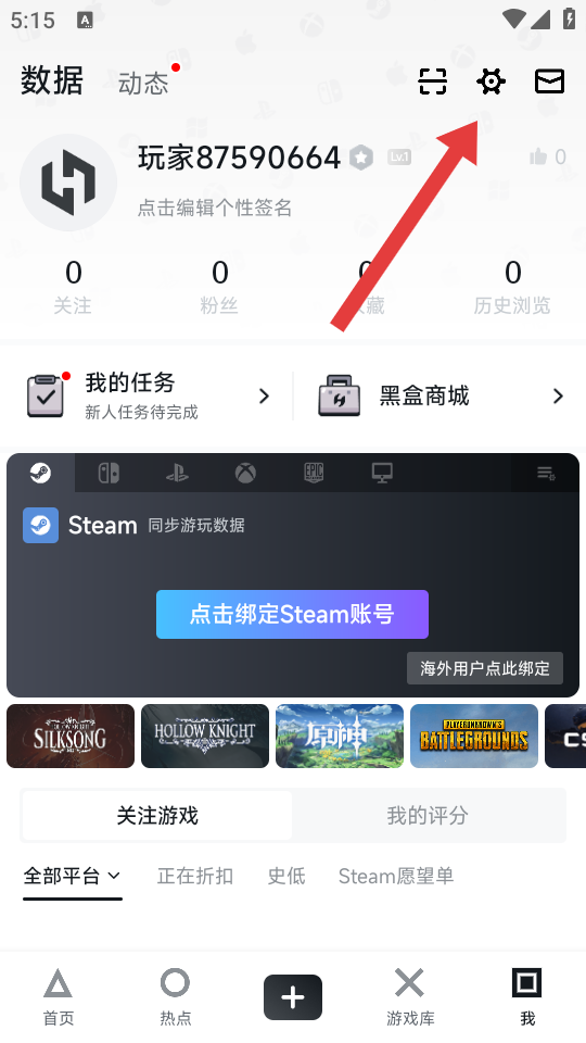 1、在小黑盒首頁(yè)底部導(dǎo)航欄,點(diǎn)擊最右側(cè)的我,進(jìn)入個(gè)人中心頁(yè)面。