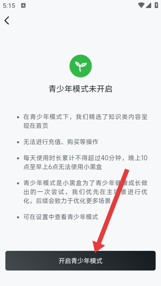 4、在青少年模式說(shuō)明頁(yè)面,點(diǎn)擊開(kāi)啟青少年模式按鈕,完成青少年模式開(kāi)啟。