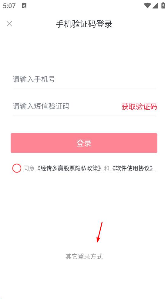 2、在登錄頁面,若選擇手機驗證碼登錄,先輸入手機號,再點擊“獲取驗證碼”,收到驗證碼后輸入,然后勾選同意經傳多贏股票隱私政策和軟件使用協(xié)議,最后點擊“登錄”。