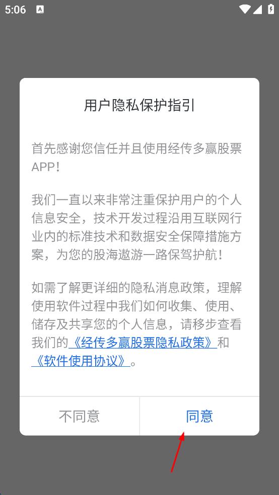 1、進入經傳多贏股票APP后,會彈出用戶隱私保護指引界面,點擊“同意”按鈕,進入登錄頁面。