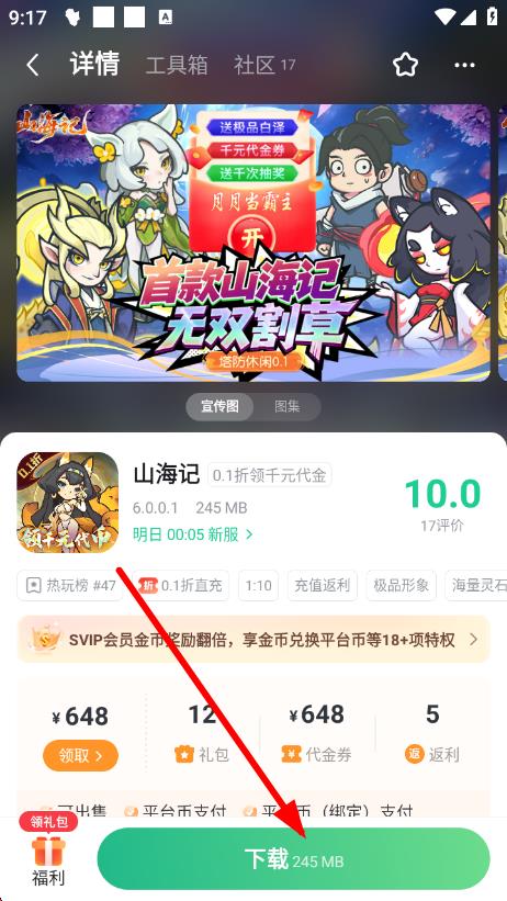3、點(diǎn)擊游戲進(jìn)入詳情頁(yè),了解游戲介紹、福利活動(dòng)等,再點(diǎn)擊下載,安裝完成后就能開(kāi)始玩游戲了。