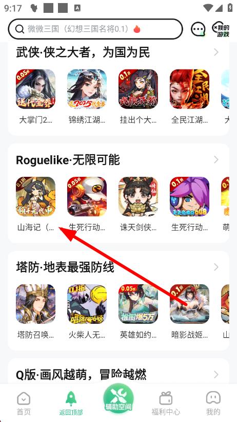 2、在游戲庫(kù)中,按分類瀏覽找到感興趣的游戲,比如在Roguelike分類里找到山海記。
