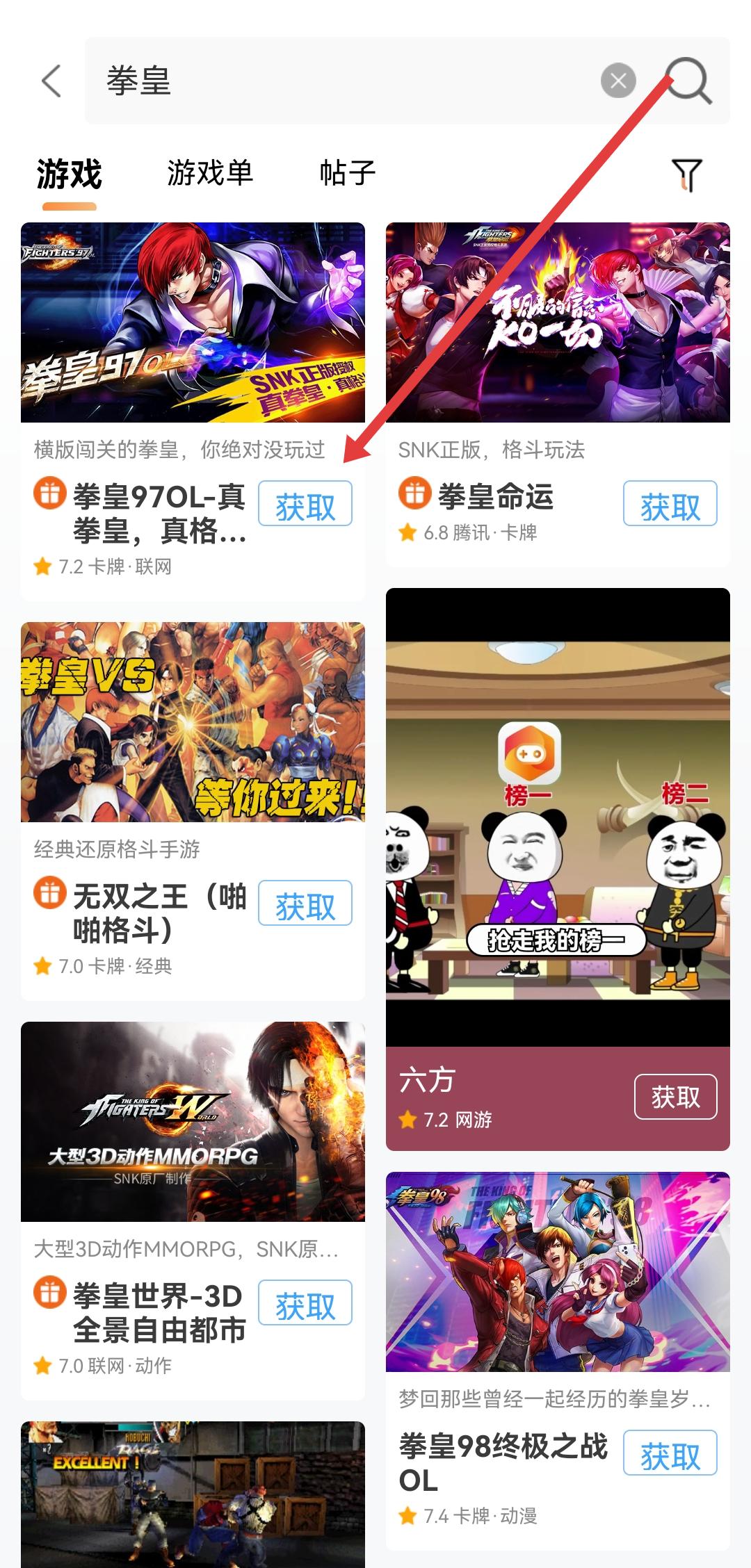 2、在搜索結(jié)果頁(yè)面中,找到想要游玩的拳皇游戲,點(diǎn)擊游戲下方的獲取按鈕下載游戲,完成下載后才能啟動(dòng)游玩。