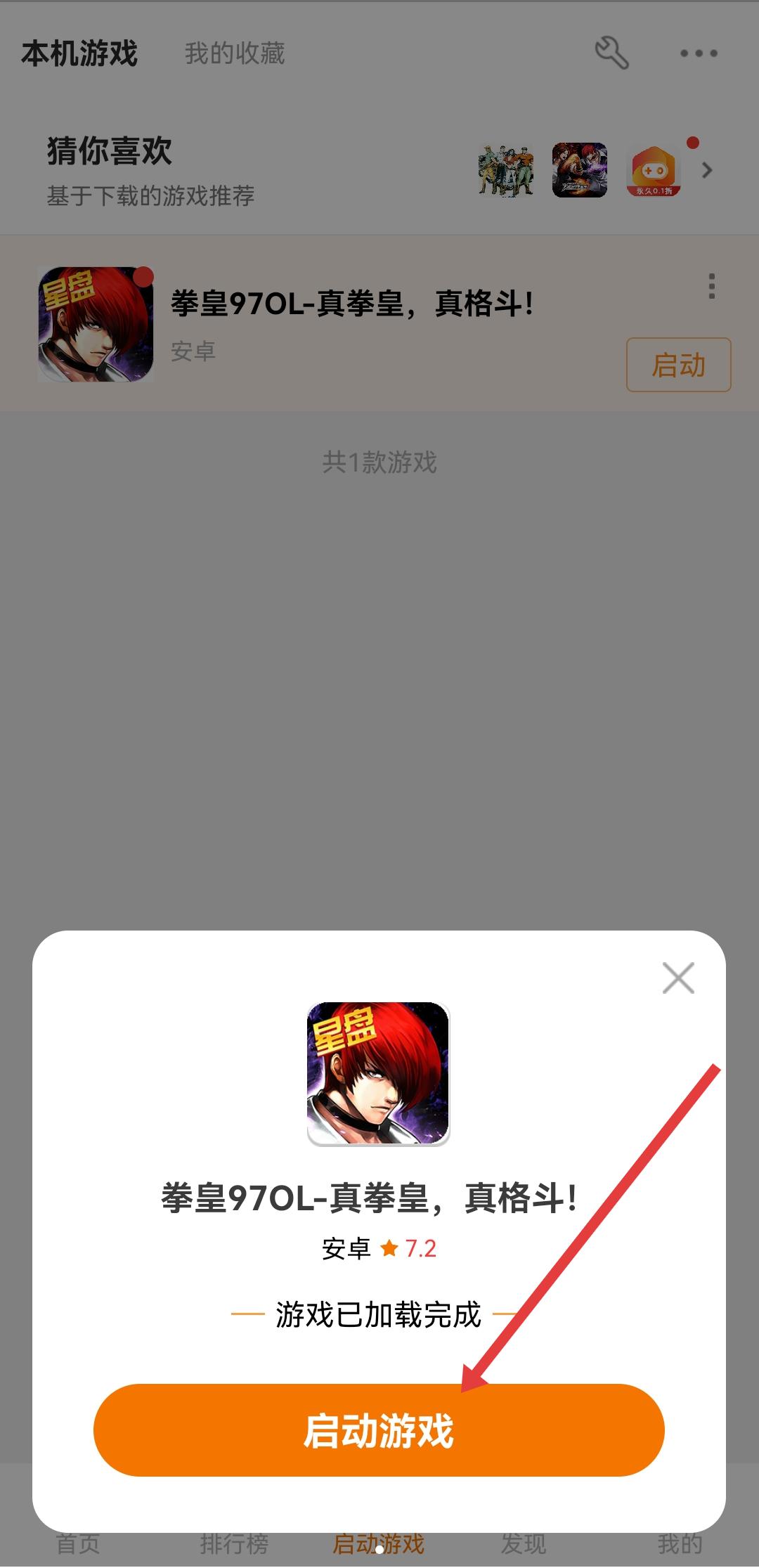 3、游戲下載完成后,會(huì)彈出啟動(dòng)游戲提示框,點(diǎn)擊橙色的啟動(dòng)游戲按鈕,即可進(jìn)入拳皇游戲開(kāi)始游玩。