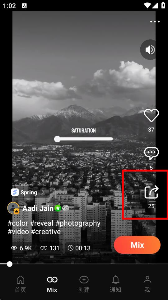 2、在Mix頁(yè)面找到要分享的視頻,點(diǎn)擊視頻界面右側(cè)帶有箭頭的分享圖標(biāo)。