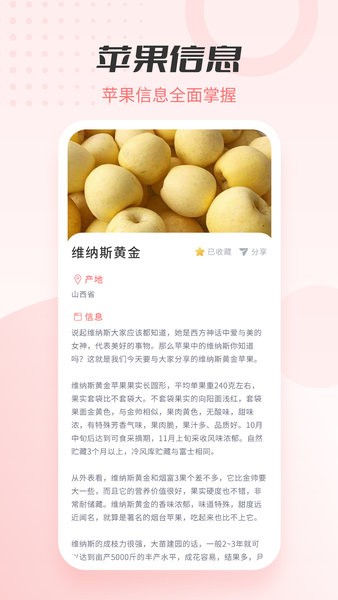 動聽蘋果大全手機(jī)版是介紹各種蘋果知識的小百科,上面有著豐富的信息可以查看,從蘋果的品種產(chǎn)地到相關(guān)知識的介紹,都詳細(xì)的羅列了出來,讓你知道什么時候該吃什么類型的蘋果,還能學(xué)習(xí)新知識!