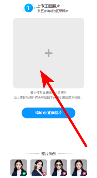 2、進(jìn)入藝術(shù)照界面后,點擊界面中的加號區(qū)域,上傳一張五官清晰的正面照片。