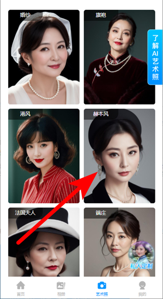 3、上傳照片后,在下方選擇想要生成的藝術(shù)照造型,比如婚紗、旗袍、港風(fēng)等。