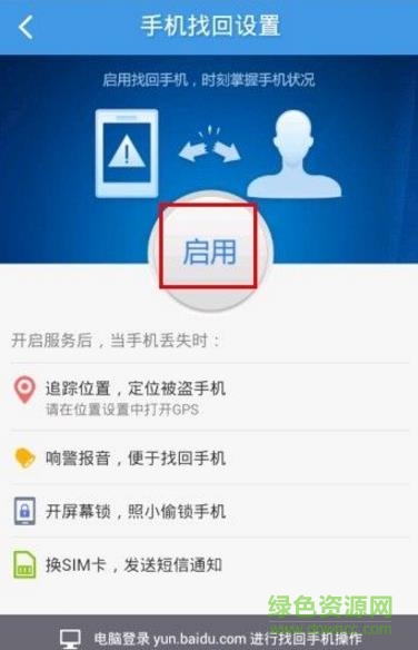 “手機找回”是百度云的特有功能,可在線追蹤手機位置,提升手機找回的可能性。用戶只要在百度云手機端“發(fā)現”中開啟“手機找回”功能,便可通過百度云網頁版(yun.baidu.com)中的“手機找回”實現跟蹤。具有手機找回的特殊功能,開啟手機找回功能后再也不用擔心手機丟失了!