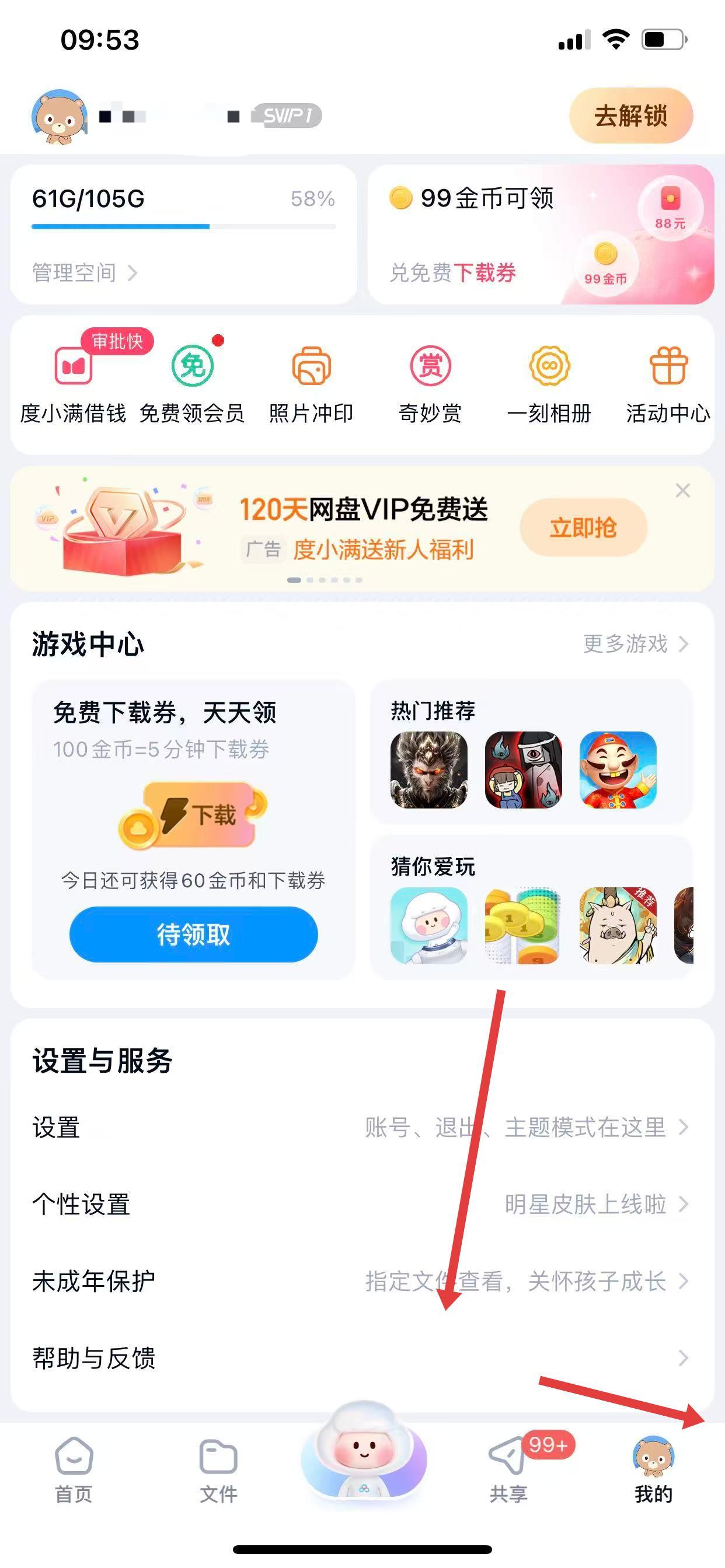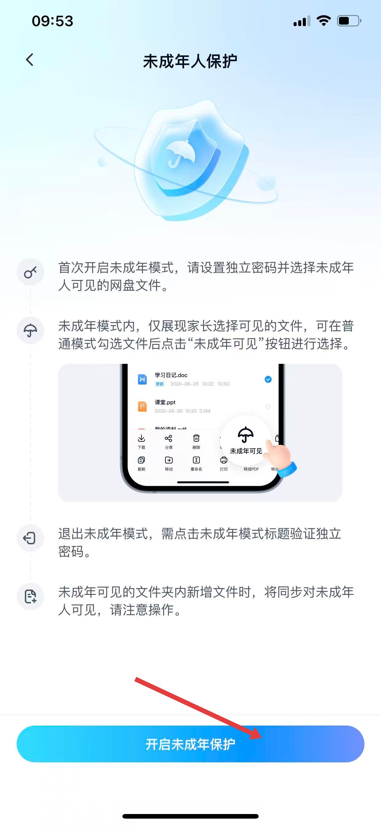 1、打開百度網盤App,點擊底部導航欄中的我的,點擊未成年人保護選項。