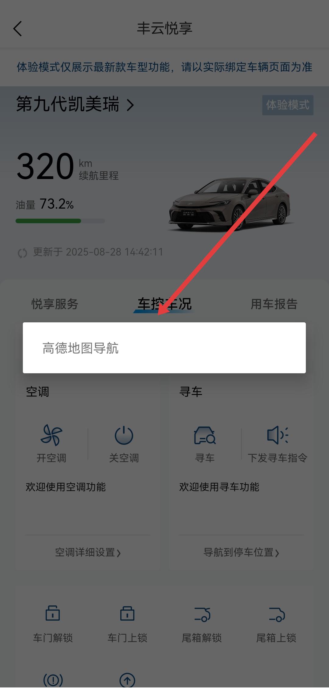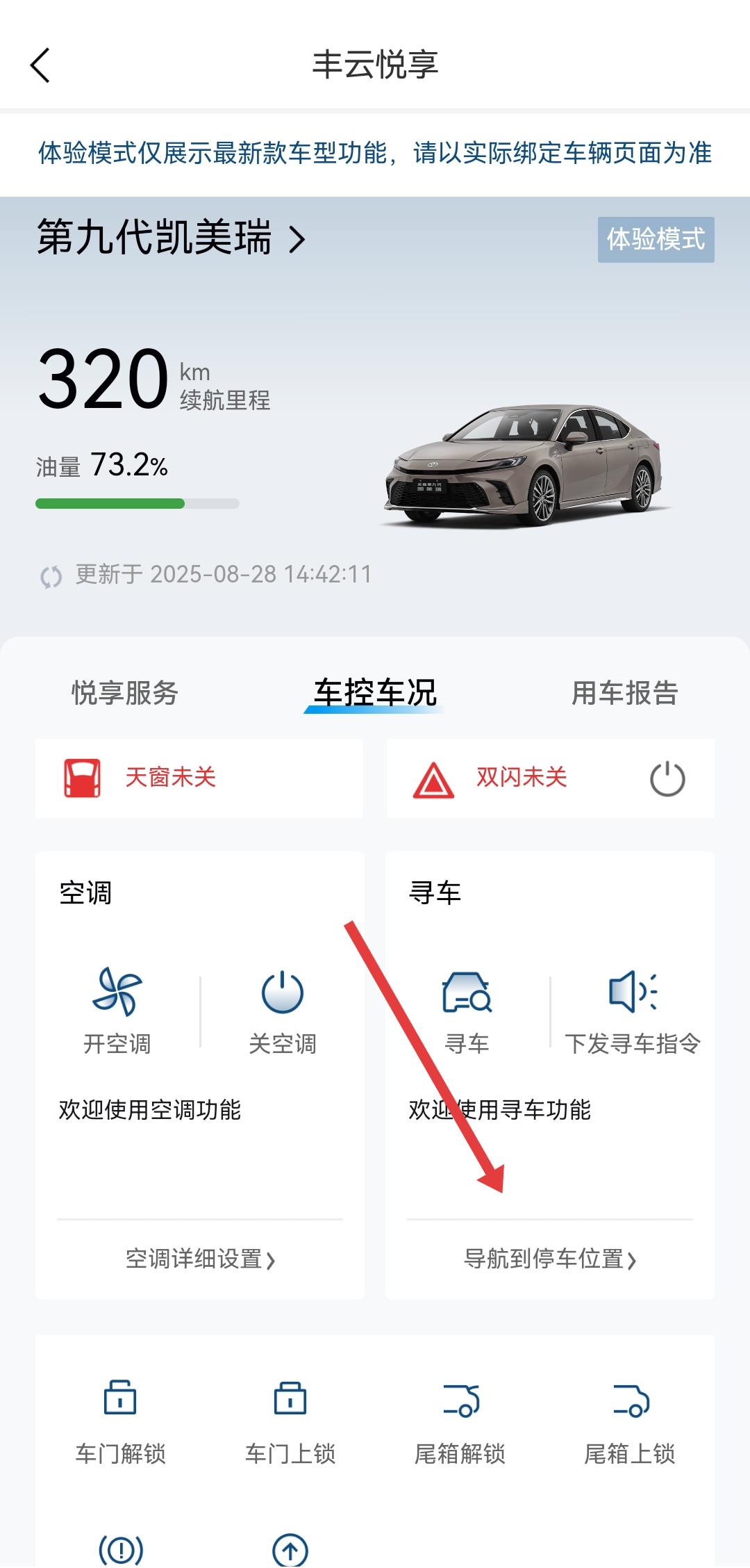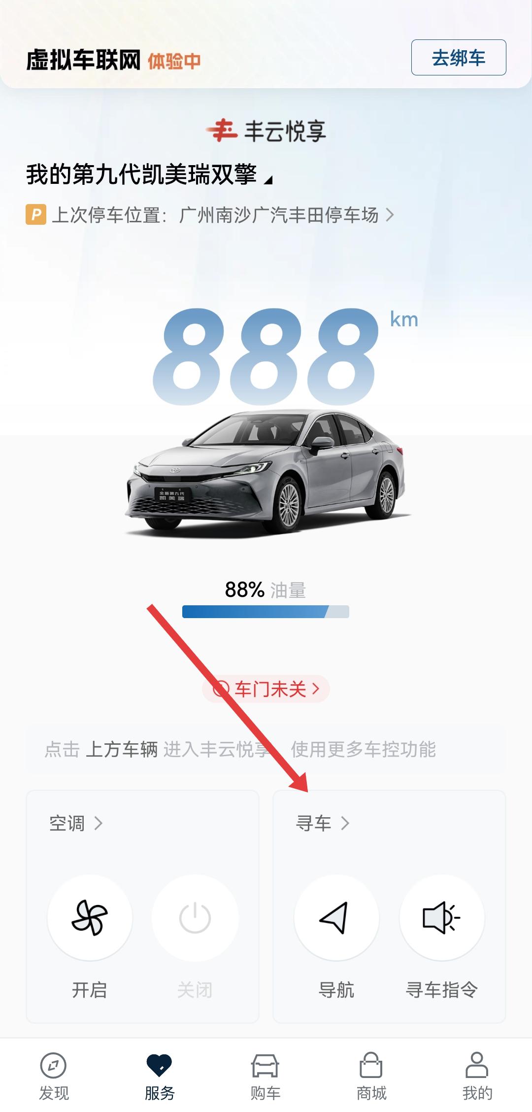 1、打開豐云行APP,進(jìn)入服務(wù)的頁面,在車輛信息下方找到尋車模塊,點(diǎn)擊進(jìn)入豐云悅享的車控車況界面。