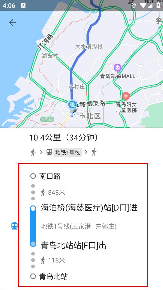 4、選擇好換乘方案后,進(jìn)入該方案的詳細(xì)換乘指引頁(yè)面,可查看具體的步行距離、乘坐的公交或地鐵線路以及進(jìn)出站口等信息,按照指引進(jìn)行換乘。
