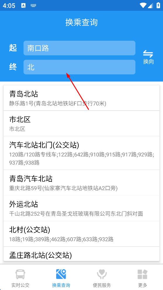 2、輸入目的地后,從彈出的相關(guān)地點(diǎn)列表中,選擇準(zhǔn)確的目的地,比如“青島北站”。