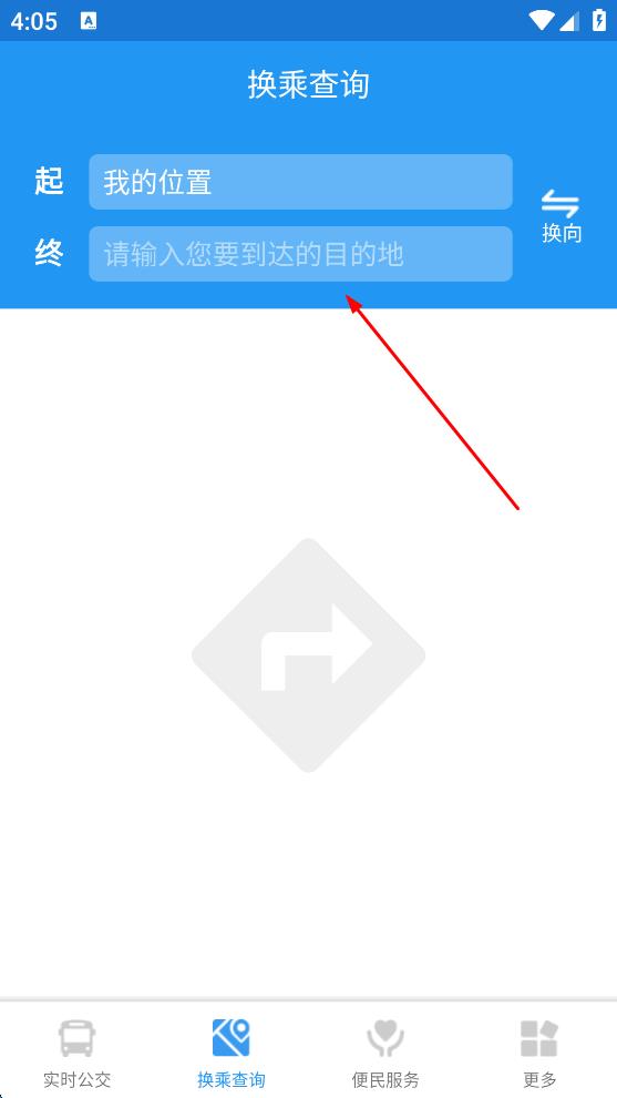 1、打開公交換乘查詢軟件,進(jìn)入“換乘查詢”頁(yè)面,在“起”欄確認(rèn)或修改出發(fā)位置,在“終”欄輸入要到達(dá)的目的地。