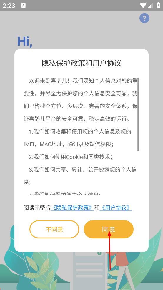 1、打開喜鵲兒APP,在“隱私保護政策和用戶協(xié)議”彈窗中,點擊“同意”,進入選擇學(xué)校頁面。