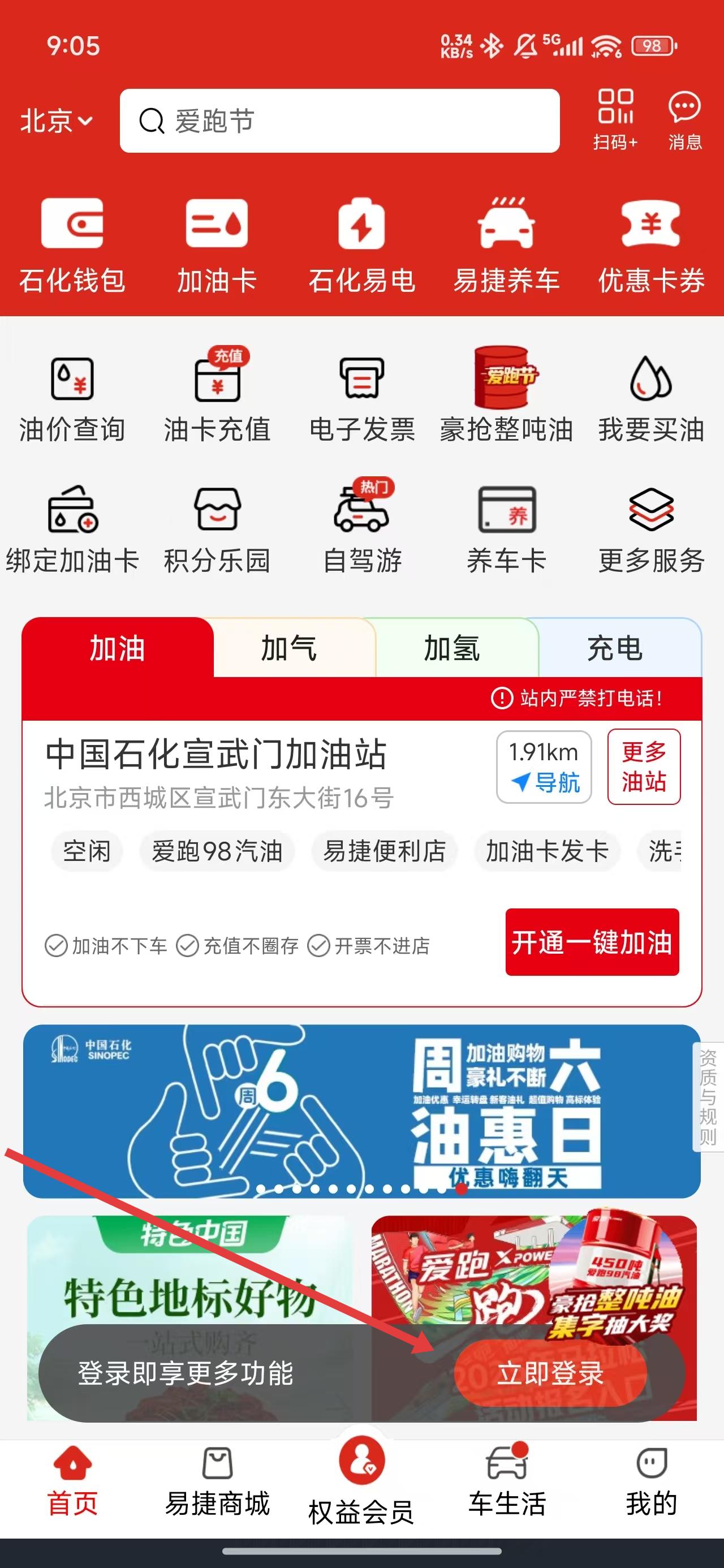1、在加油中石化首頁中點擊立即登錄按鈕,開始登錄賬號操作。
