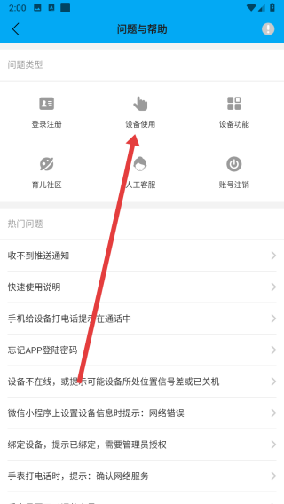 2、在進(jìn)入到問題與幫助頁面中,可以點(diǎn)擊設(shè)備使用選項(xiàng),進(jìn)入查看相關(guān)問題與解決方法。