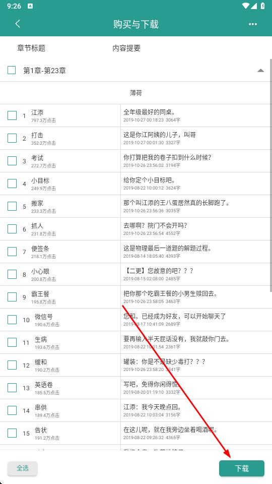 3、進入章節(jié)列表,勾選需下載的章節(jié)后,點擊下載按鈕,即可離線獲取章節(jié)內(nèi)容。