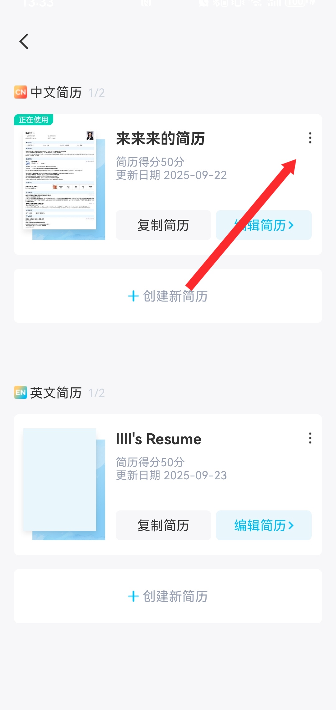 2、在簡歷管理頁面,點擊目標簡歷右上角的圖標,調(diào)出操作選項。