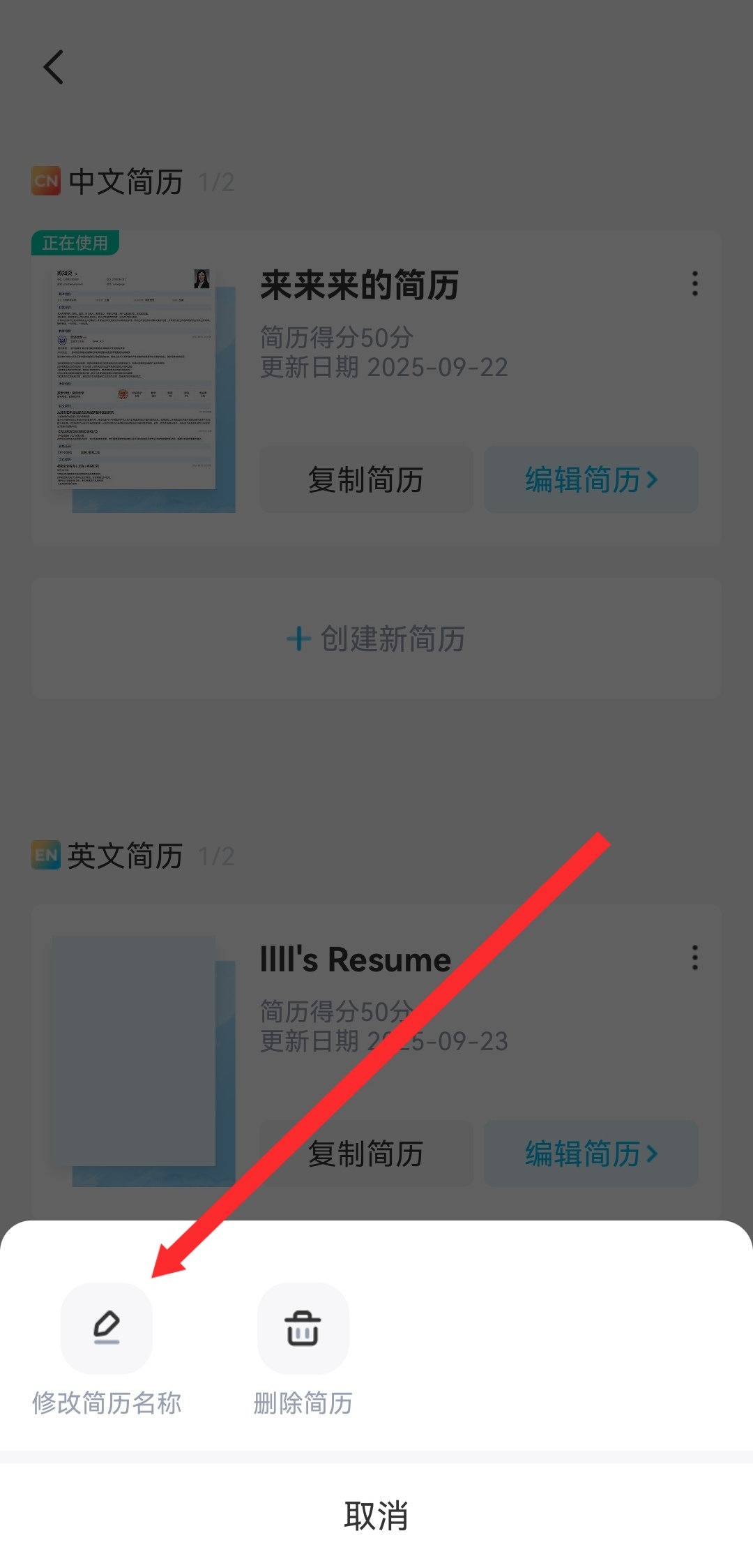 3、在彈出的操作選項中,點擊修改簡歷名稱,進入修改彈窗。