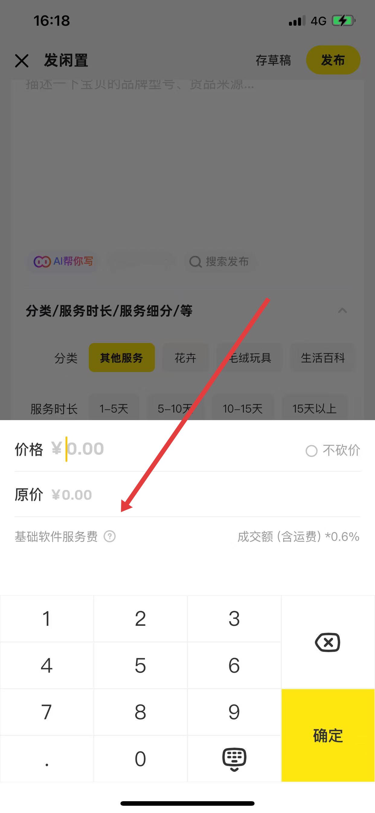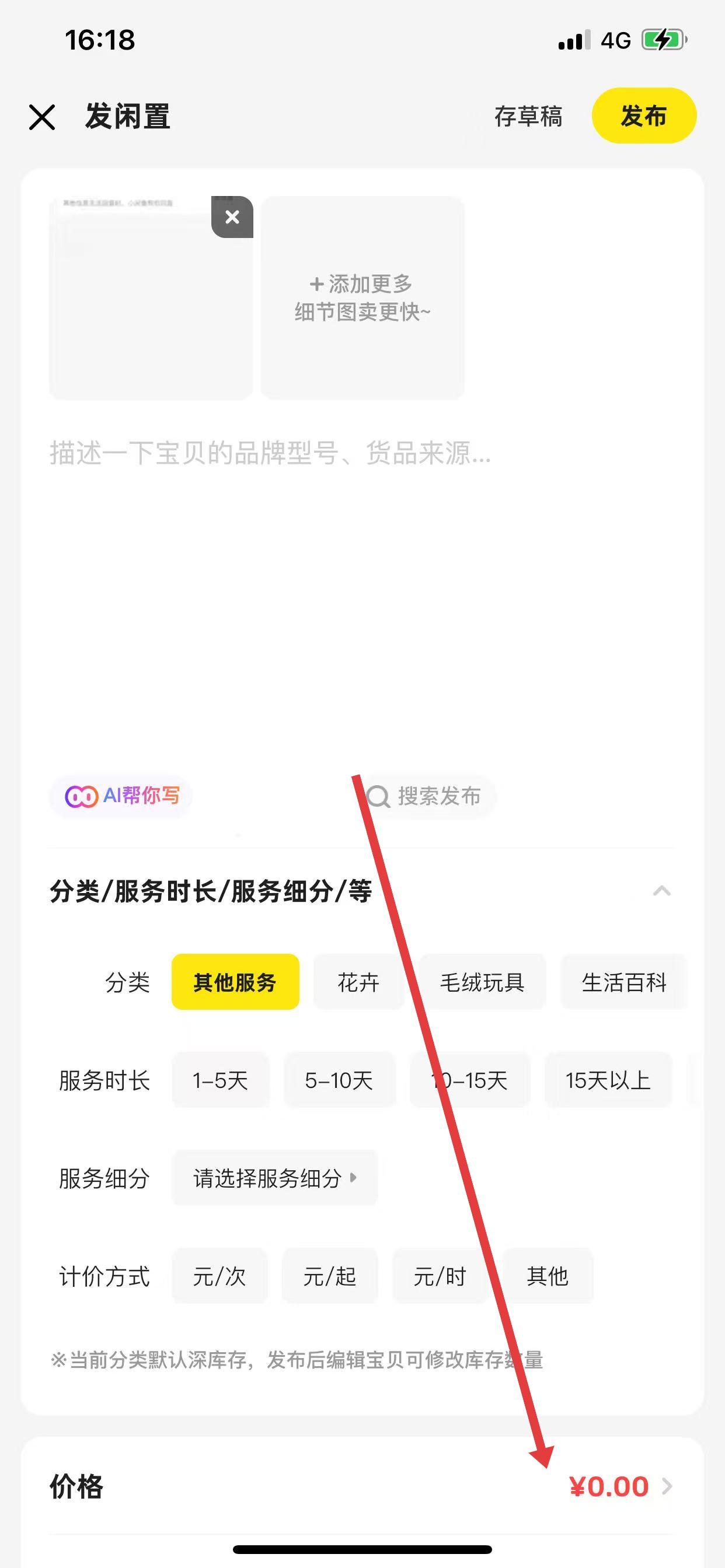 2、在發(fā)閑置頁面,完成商品圖片添加、商品描述等信息填寫,接著點擊價格選項,進入價格設(shè)置界面。