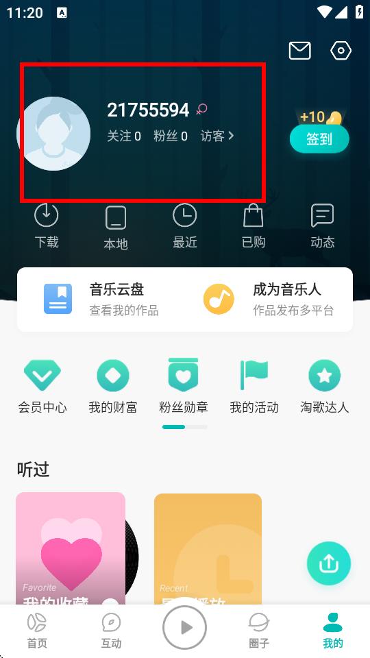 1、打開5sing音樂APP進入我的界面,點擊上方個人頭像區(qū)域進入個人主頁。