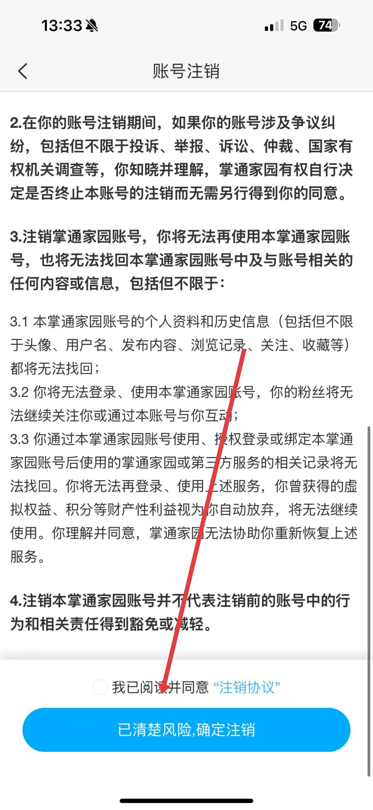 4、仔細(xì)閱讀賬號(hào)注銷(xiāo)相關(guān)協(xié)議及提示,點(diǎn)擊已清楚風(fēng)險(xiǎn),確定注銷(xiāo)按鈕,按照后續(xù)提示完成賬號(hào)注銷(xiāo)操作。
