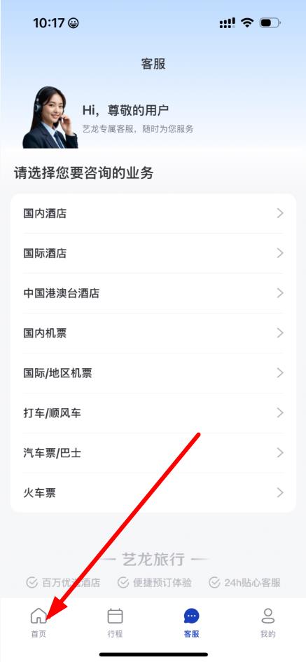 1、打開(kāi)藝龍旅行app,點(diǎn)擊底部首頁(yè)圖標(biāo)進(jìn)入首頁(yè)界面。
