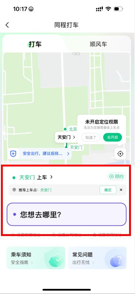 3、進(jìn)入打車(chē)頁(yè)面后系統(tǒng)會(huì)自動(dòng)定位,若未開(kāi)啟定位權(quán)限需手動(dòng)設(shè)置上車(chē)地點(diǎn)。
