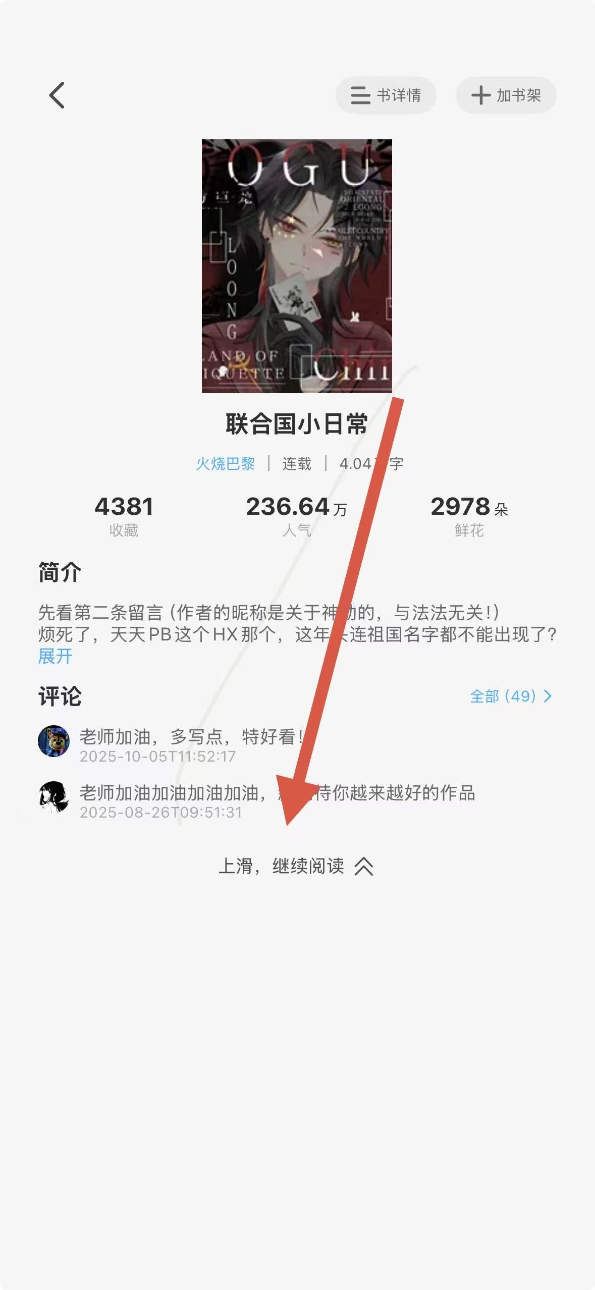 2、在小說(shuō)詳情頁(yè)面,點(diǎn)擊上滑繼續(xù)閱讀選項(xiàng),進(jìn)入小說(shuō)閱讀界面。