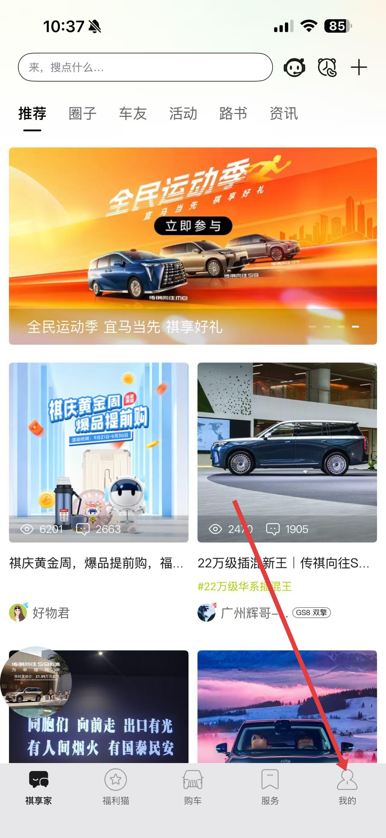 1、打開廣汽傳祺APP,點擊底部導(dǎo)航欄中的我的,進入個人相關(guān)頁面。