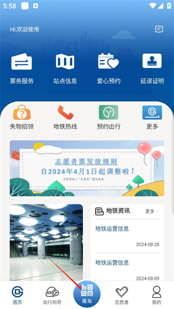 1、想要使用北京地鐵這款app乘車極為簡單,下載這款軟件點(diǎn)擊進(jìn)入,來到軟件的首頁之中,點(diǎn)擊下面中間最顯眼的【乘車】;