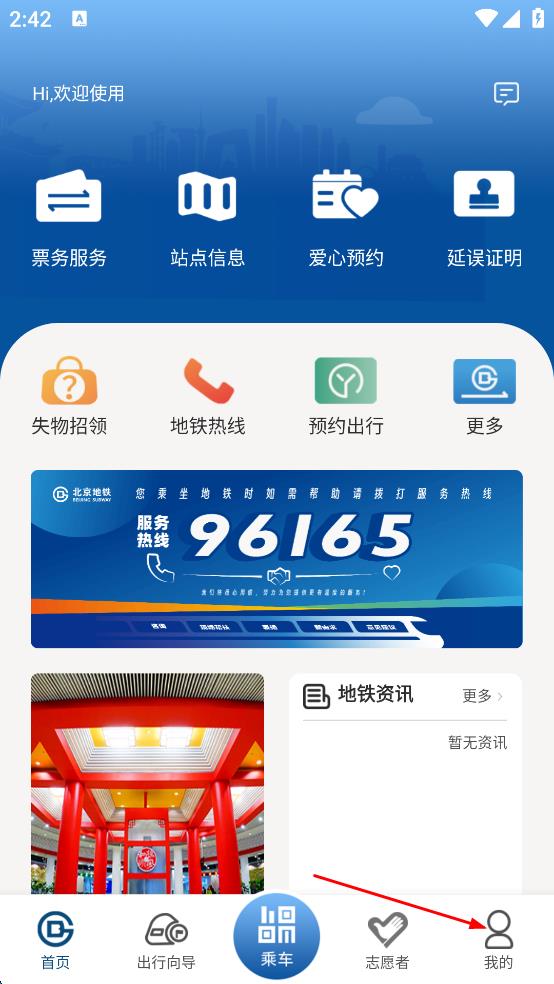 1、打開北京地鐵APP,進(jìn)入首頁后,點(diǎn)擊頁面右下角“我的”選項(xiàng)。