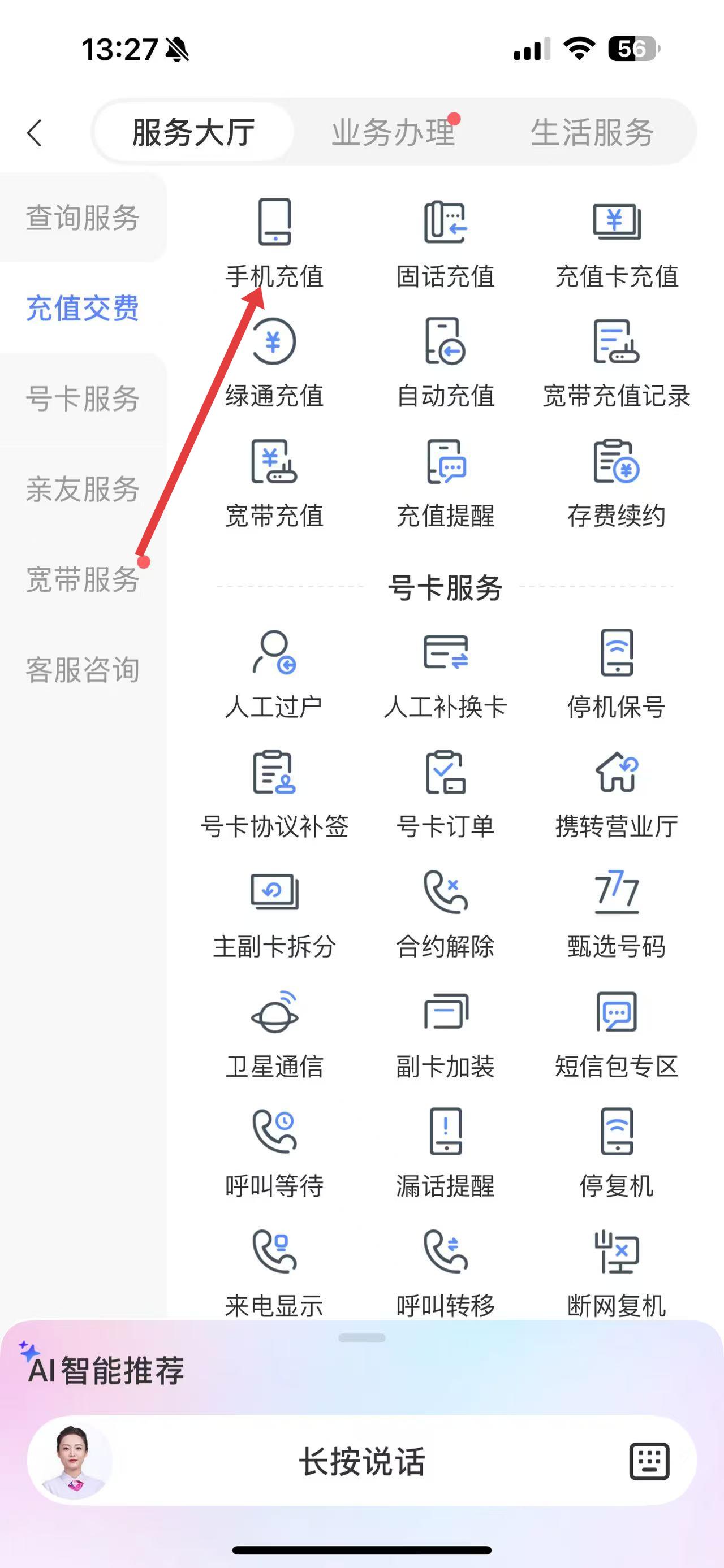 2、在服務(wù)大廳,找到充值交費(fèi)板塊,點(diǎn)擊手機(jī)充值選項(xiàng)。