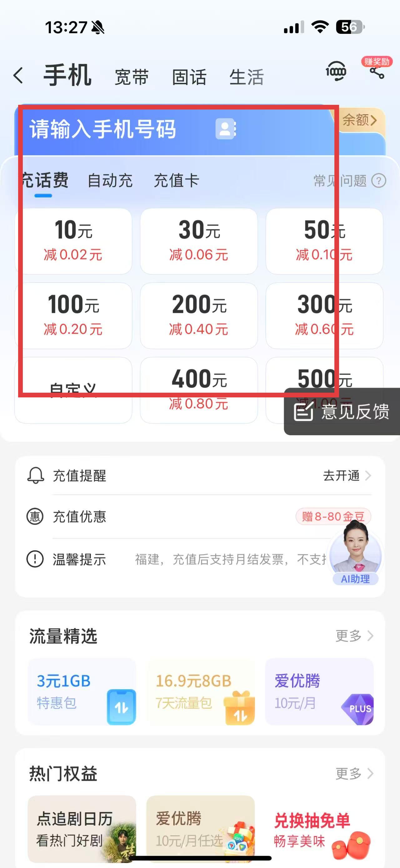 3、進(jìn)入手機(jī)充值頁(yè),輸入手機(jī)號(hào)碼,選充值金額,按流程完成話費(fèi)充值。