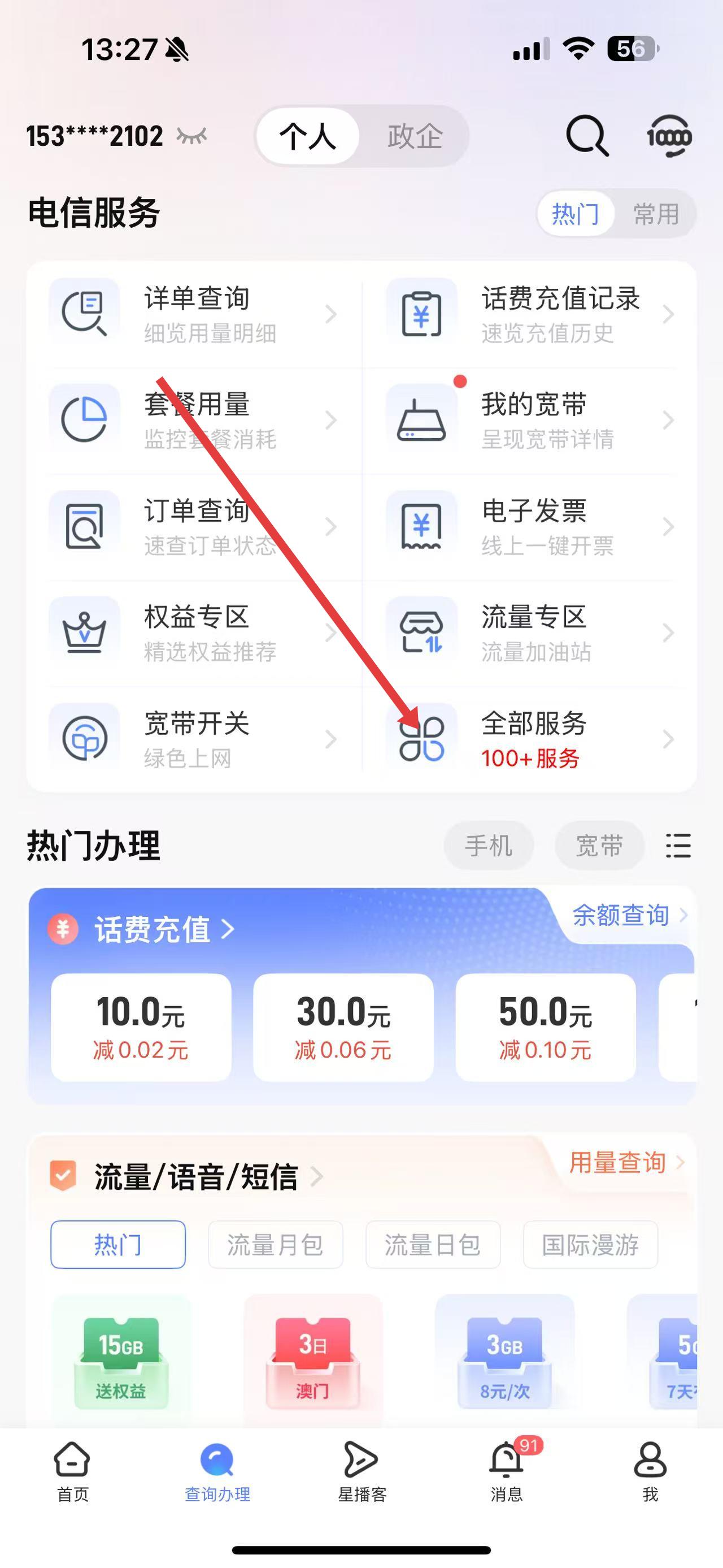 1、打開中國(guó)電信APP,進(jìn)入查詢辦理頁(yè),在電信服務(wù)中點(diǎn)擊全部服務(wù)。