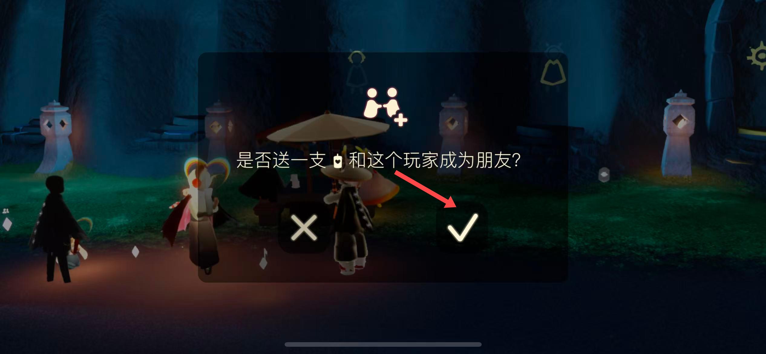 3、確認(rèn)贈(zèng)送蠟燭,點(diǎn)擊加好友圖標(biāo)后,點(diǎn)擊對(duì)勾圖標(biāo)