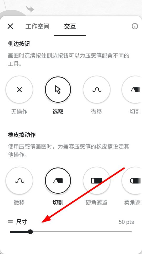 4、在設(shè)置的交互頁(yè)面,找到尺寸的滑塊,來(lái)調(diào)整橡皮擦尺寸。