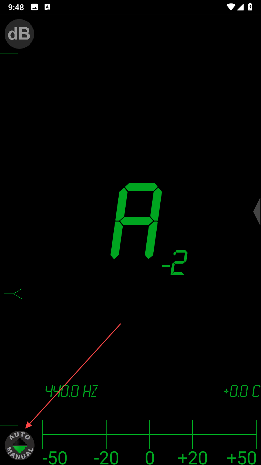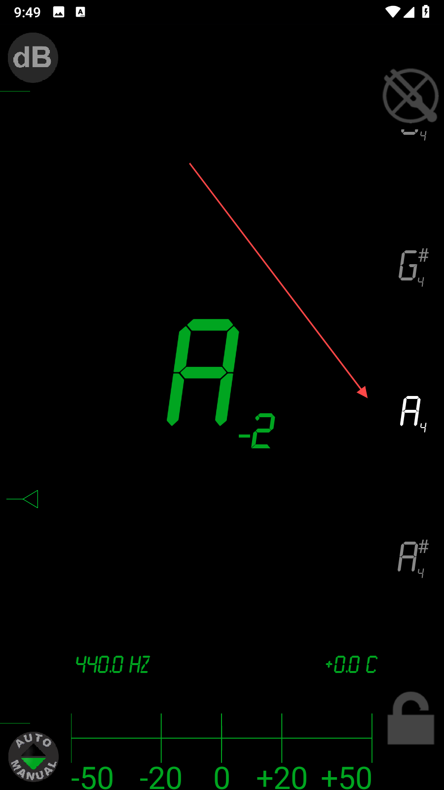 1、打開半音調諧器應用進入主界面,點擊界面左下角AUTO/MANUAL按鈕,可在自動和手動模式間切換,自動模式下應用能自動識別音調,手動模式則可自行調整參數(shù)。