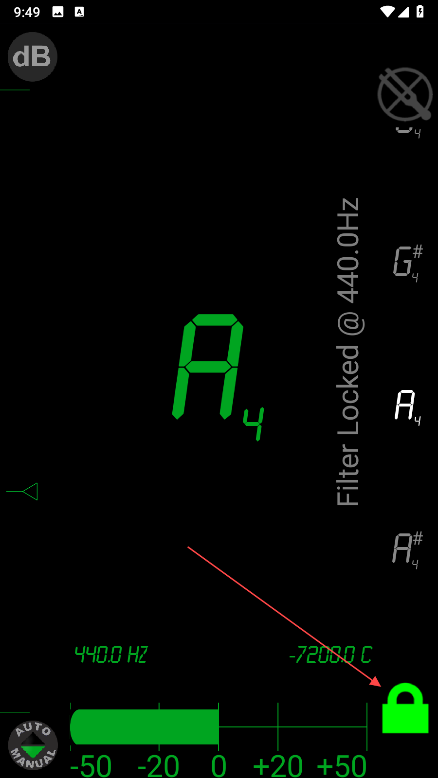 3、若要鎖定特定頻率進行精準調音,點擊界面右下角的鎖形圖標,將其變?yōu)榫G色鎖定狀態(tài),此時就能專注調整至目標頻率,確保樂器或發(fā)聲對象達到所需音準。