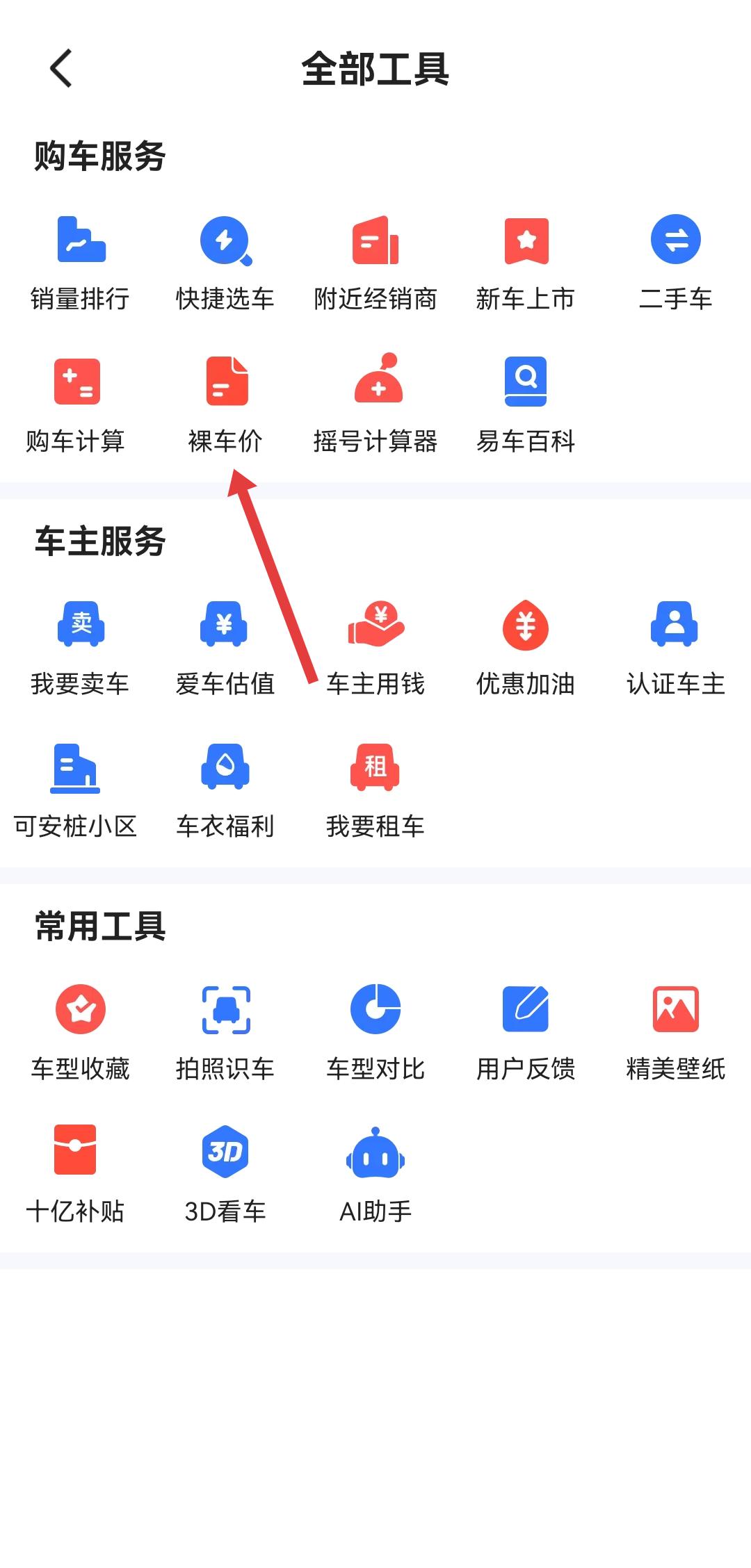 2、在全部工具頁面的購車服務(wù)區(qū)域,點擊裸車價的選項,進入查裸車價的界面。